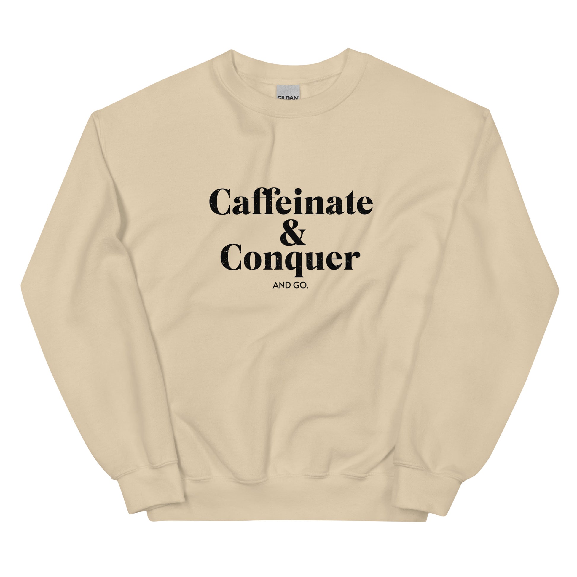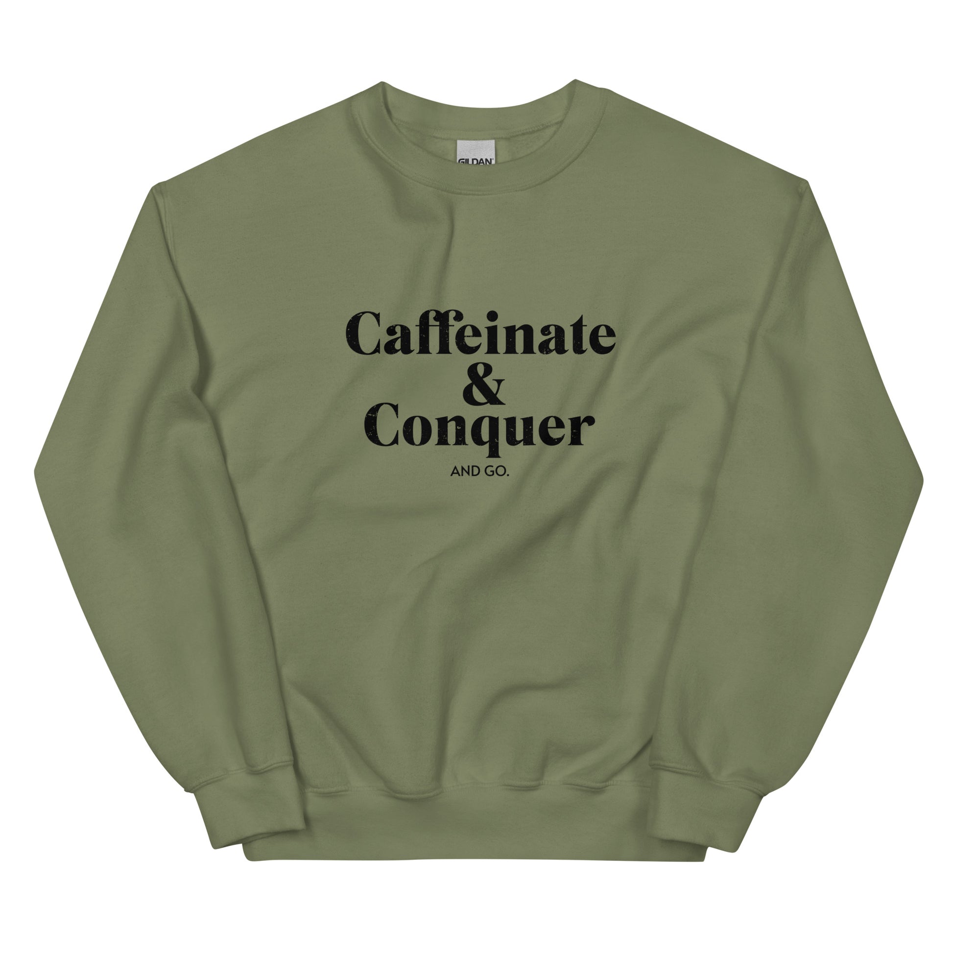 Elevate your comfort and motivation with our Gildan 18000 Unisex Sweatshirt, featuring the rallying cry: 'Caffeinate & Conquer!' Crafted with Gildan's renowned quality and cozy fleece material, this sweatshirt ensures warmth and durability for all your conquests. A sturdy and warm sweatshirt bound to keep you warm in the colder months. A pre-shrunk, classic fit sweater that’s made with air-jet spun yarn for a soft feel.